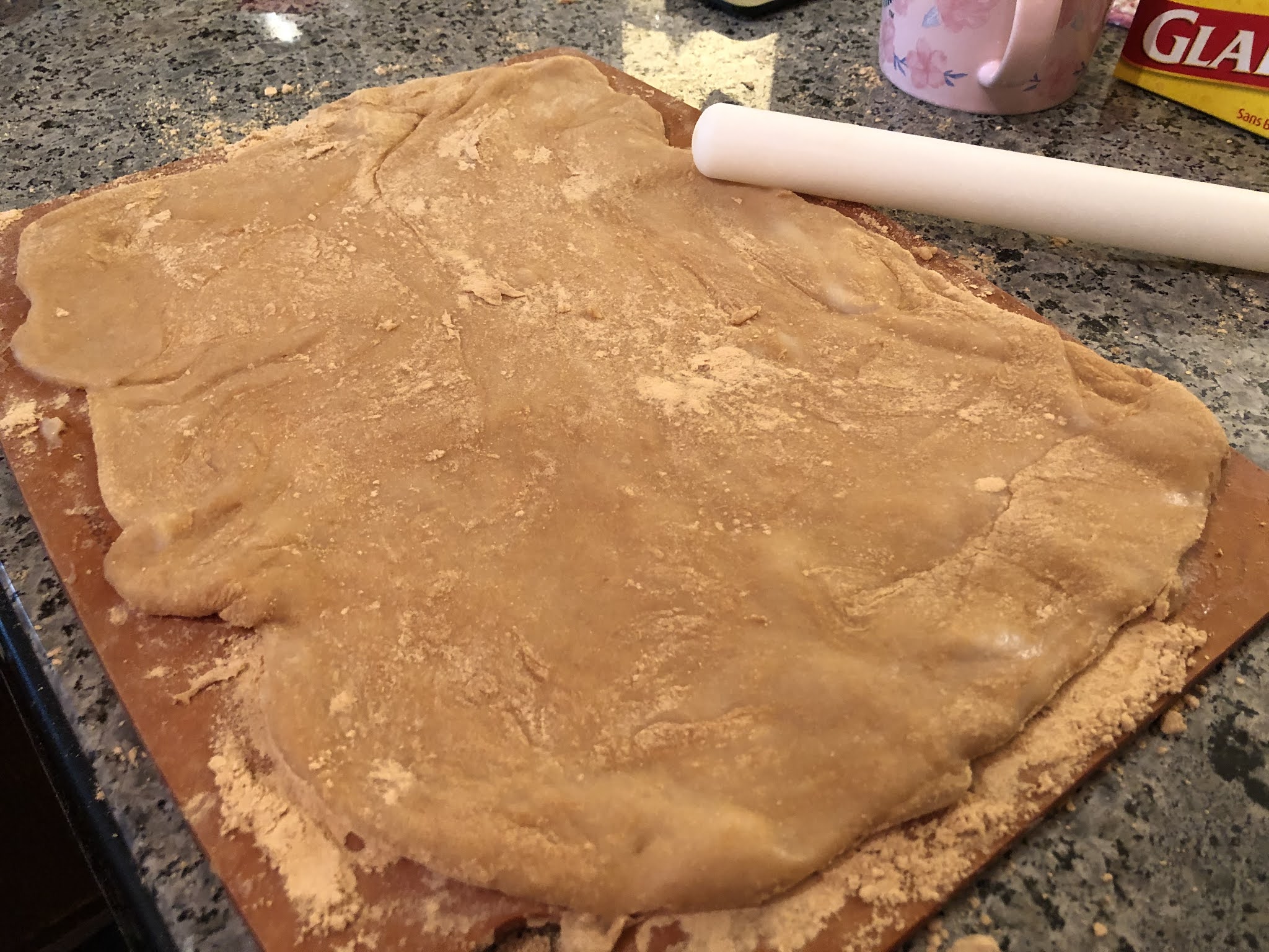 5. 把黃豆粉雙面灑在麻糬上,桿成片狀,這樣麻糬好操作,不黏手。這牌子的熟黃豆粉很不錯!
